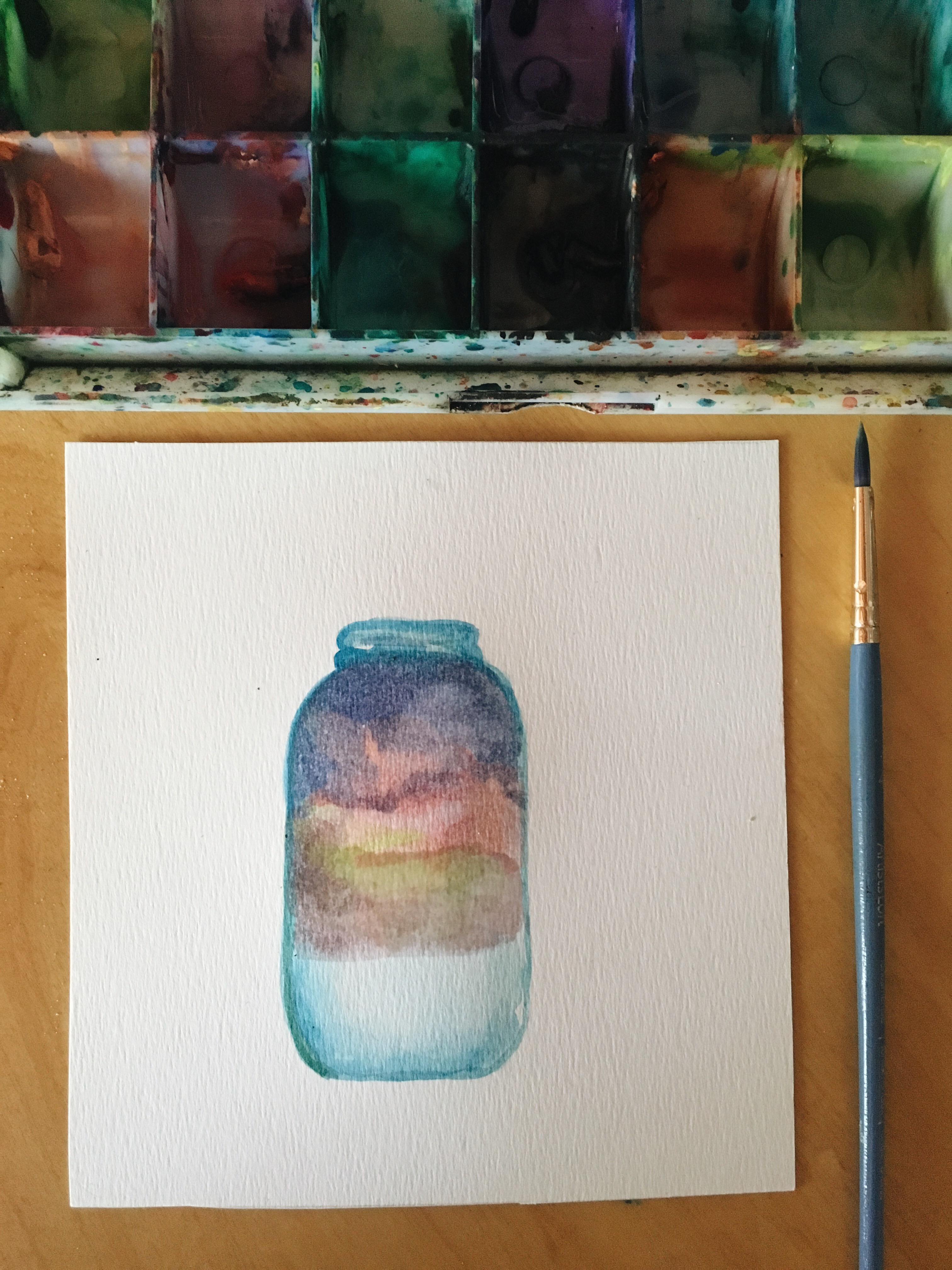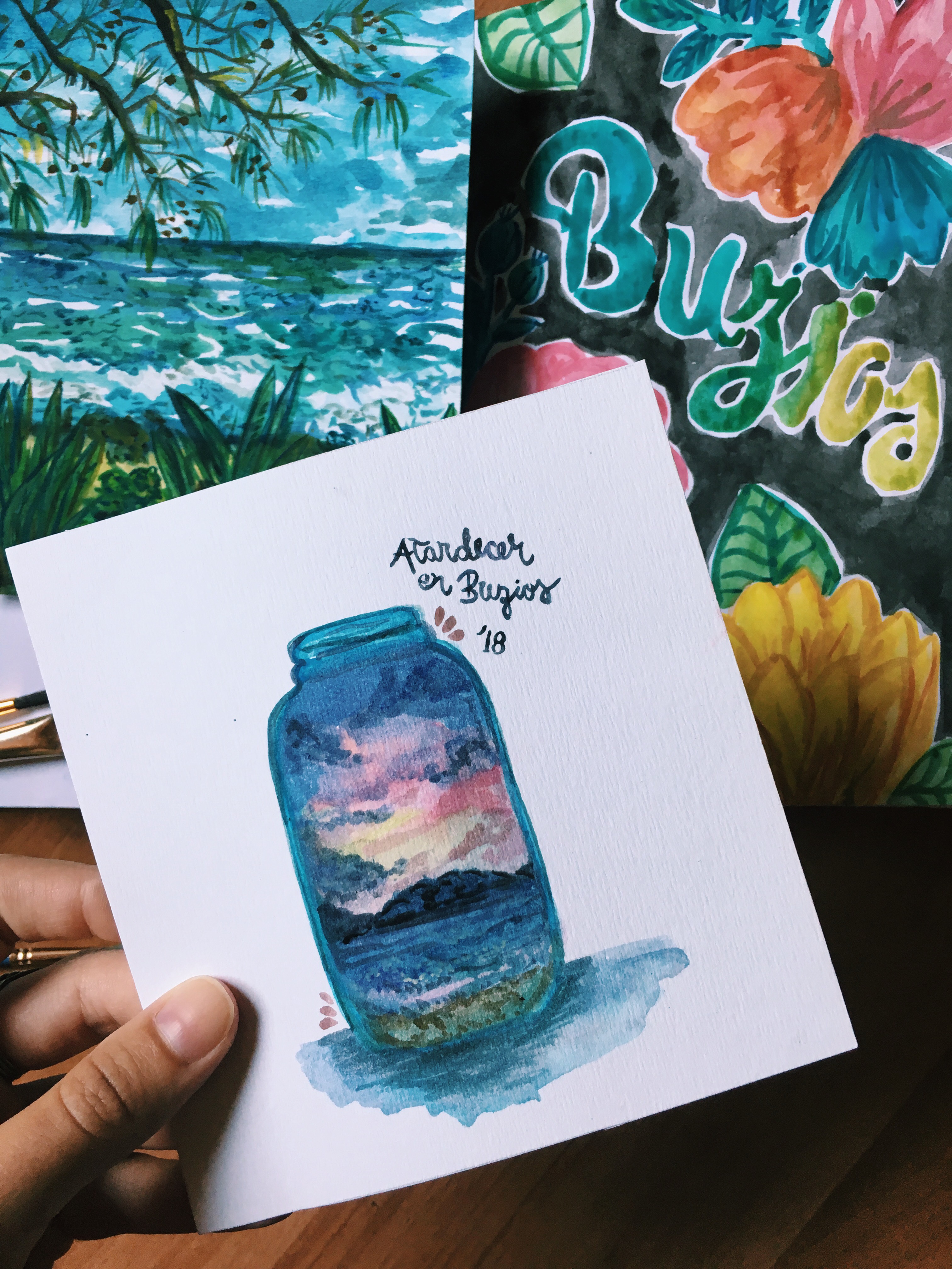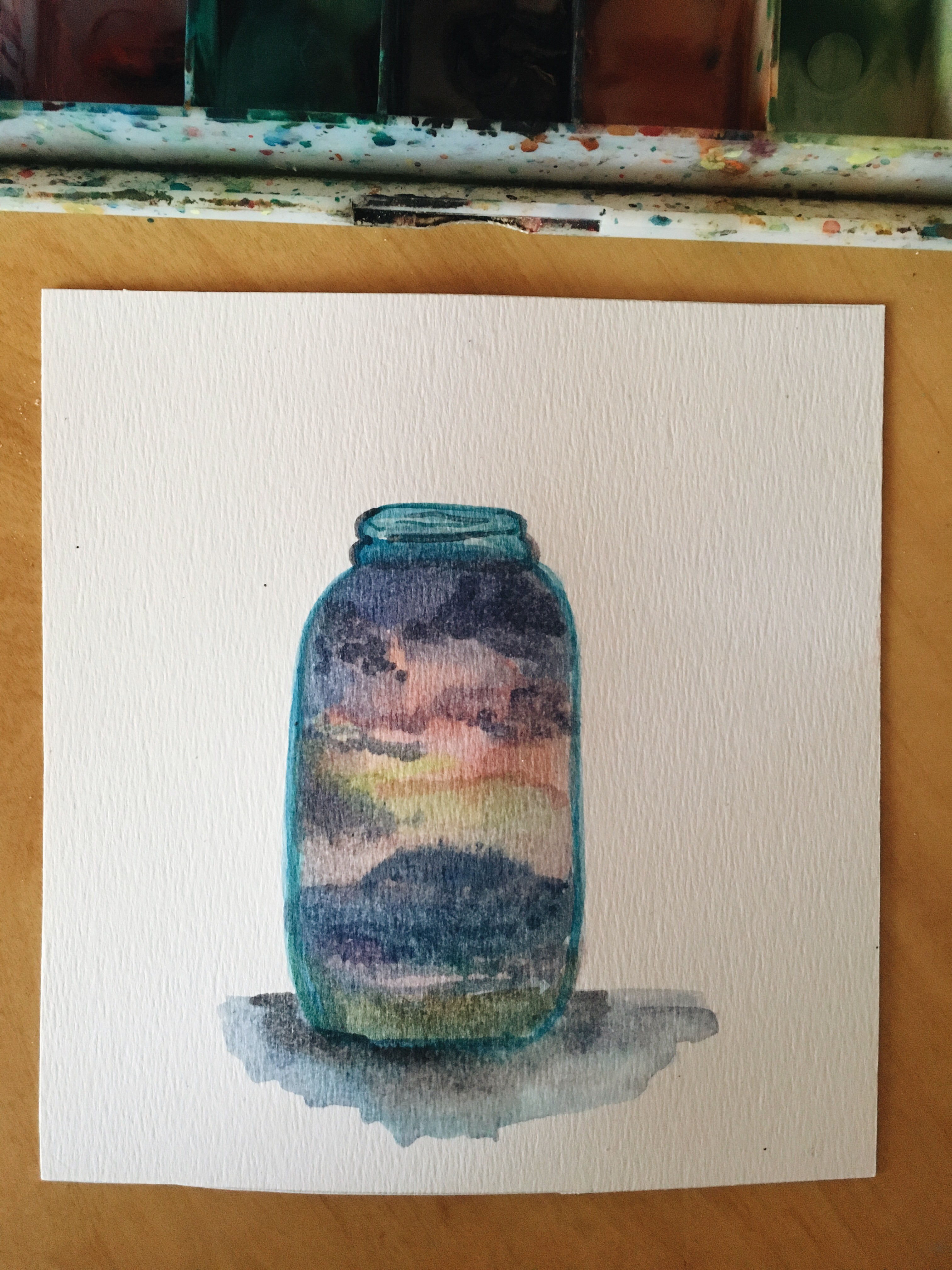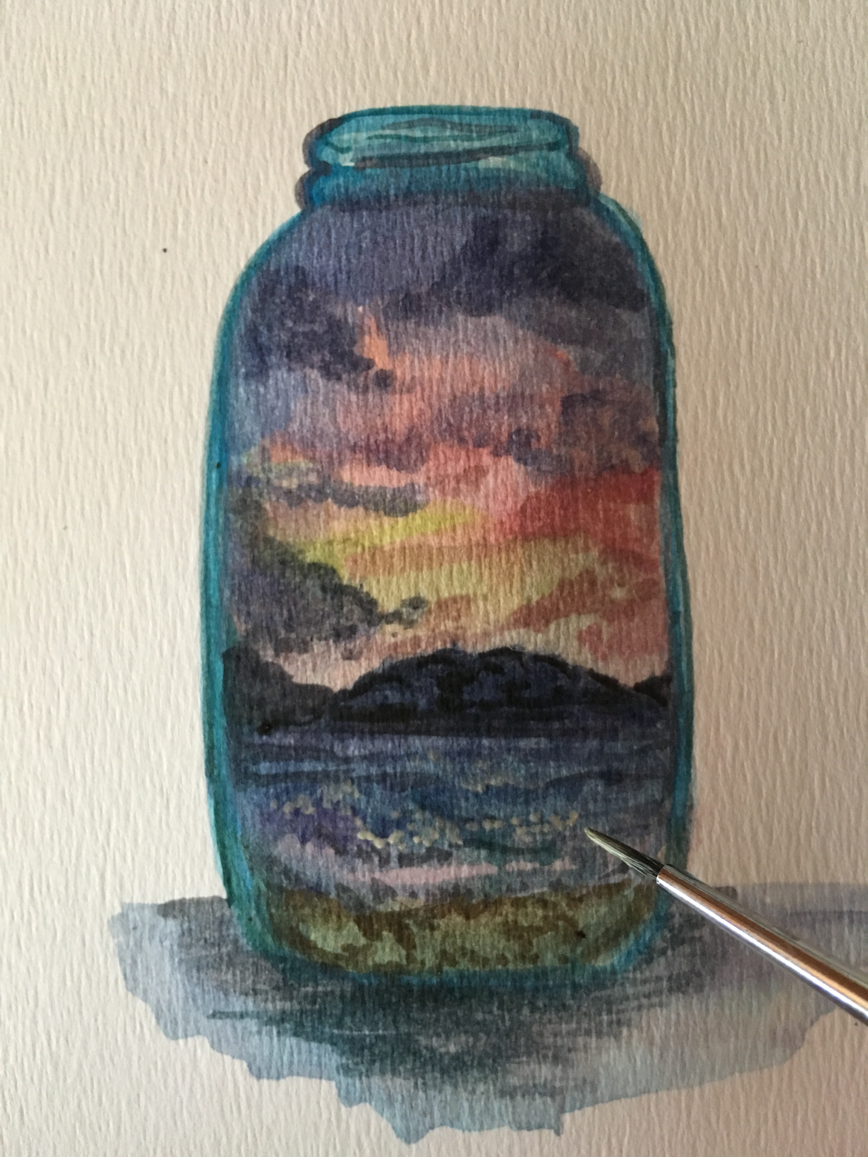 El año pasado quise hacer una recopilación de atardeceres que no fuese con fotos, y decidí reunirlos en forma de frascos pintados en acuarelas. Y en este prompt quería invitarlas a encapsular un atardecer en su propio frasco, y guardarlo para siempre en una hoja.