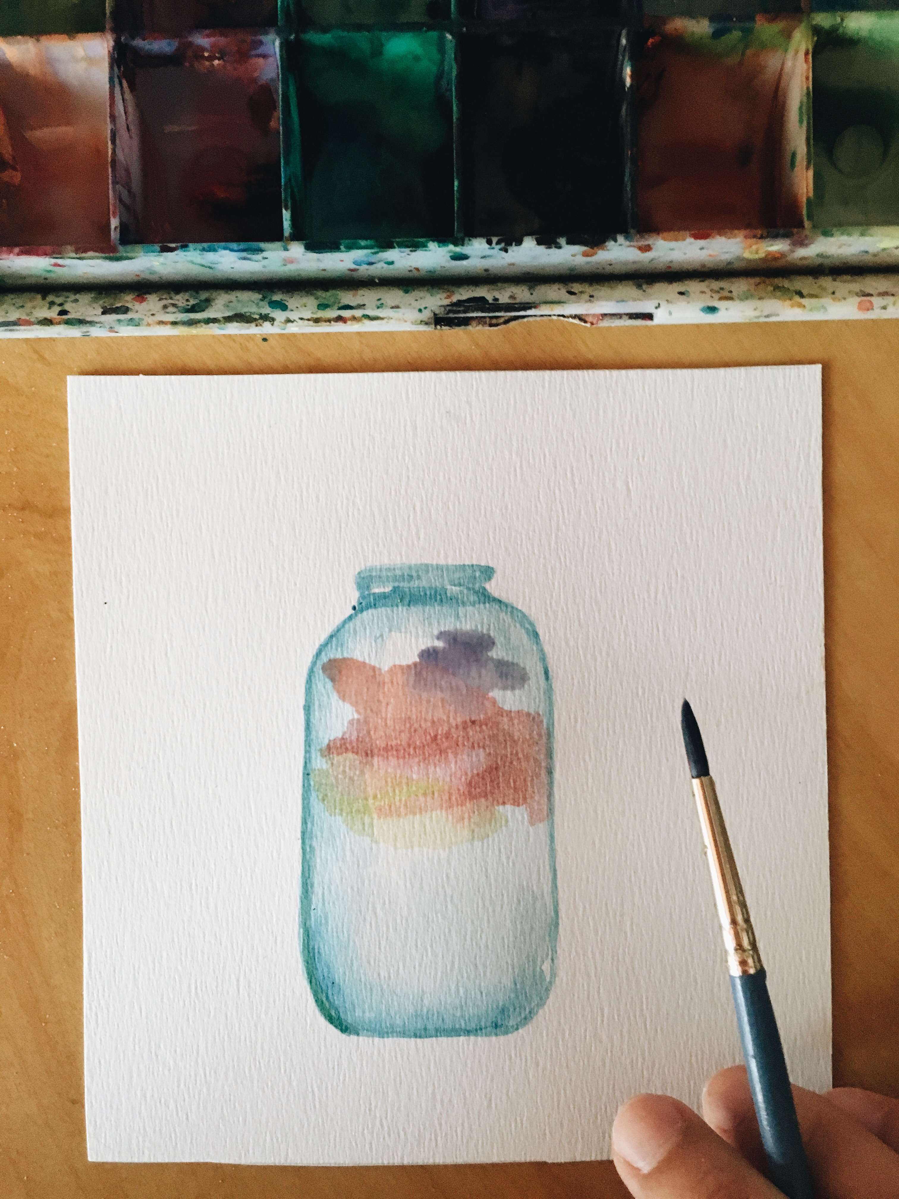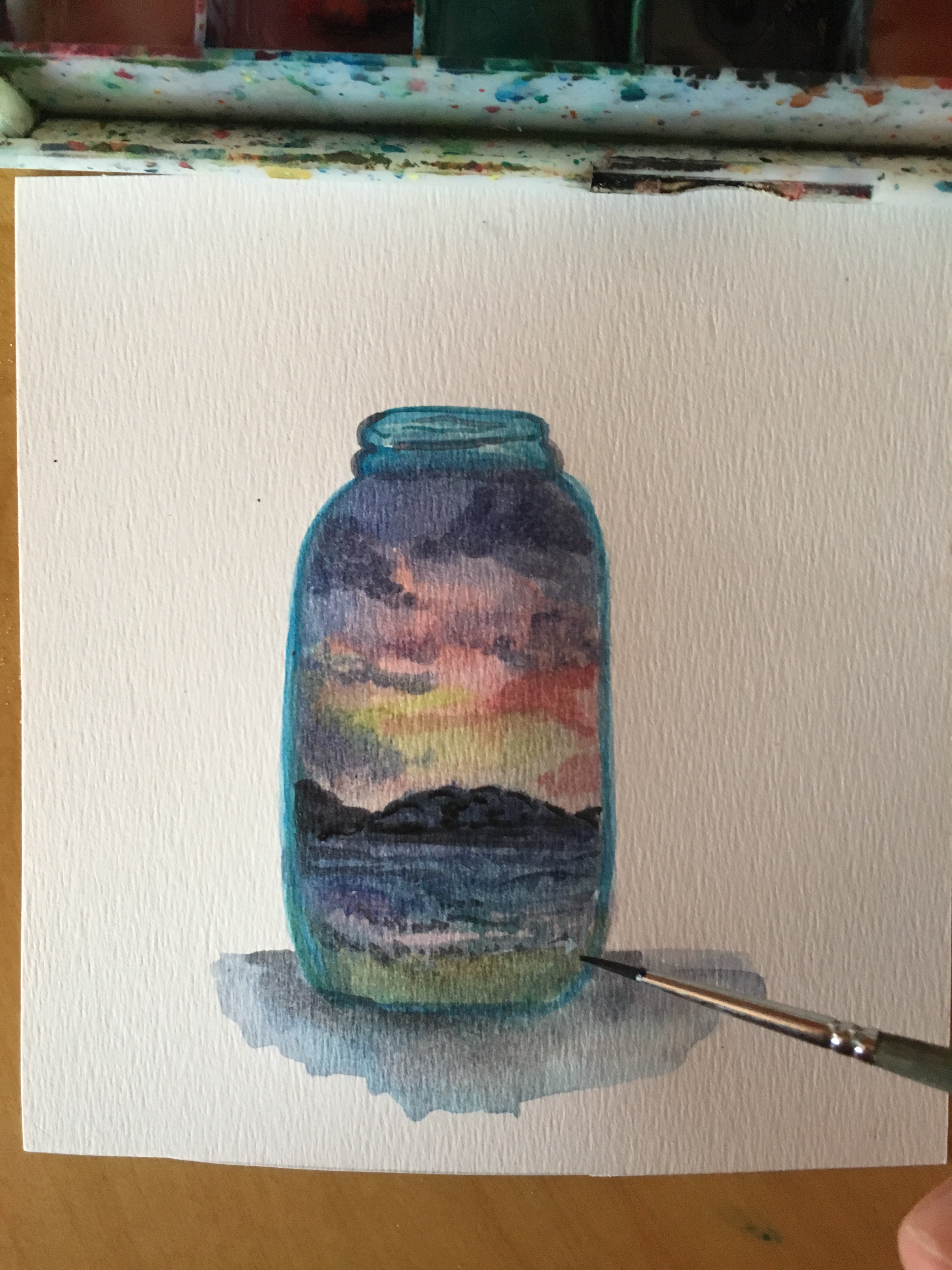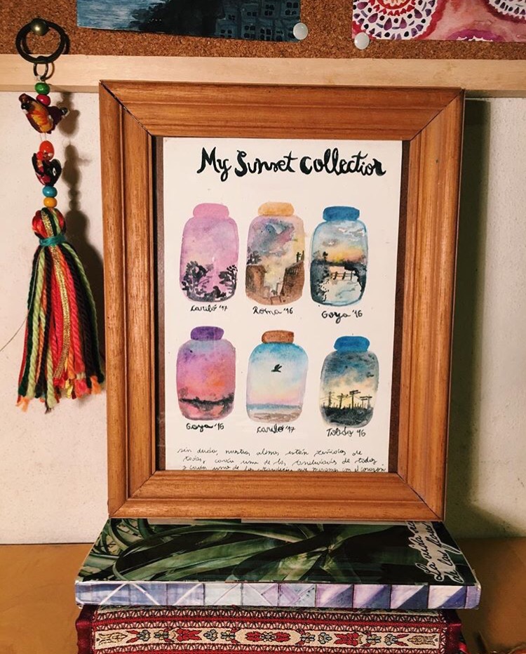 El año pasado quise hacer una recopilación de atardeceres que no fuese con fotos, y decidí reunirlos en forma de frascos pintados en acuarelas. Y en este prompt quería invitarlas a encapsular un atardecer en su propio frasco, y guardarlo para siempre en una hoja.