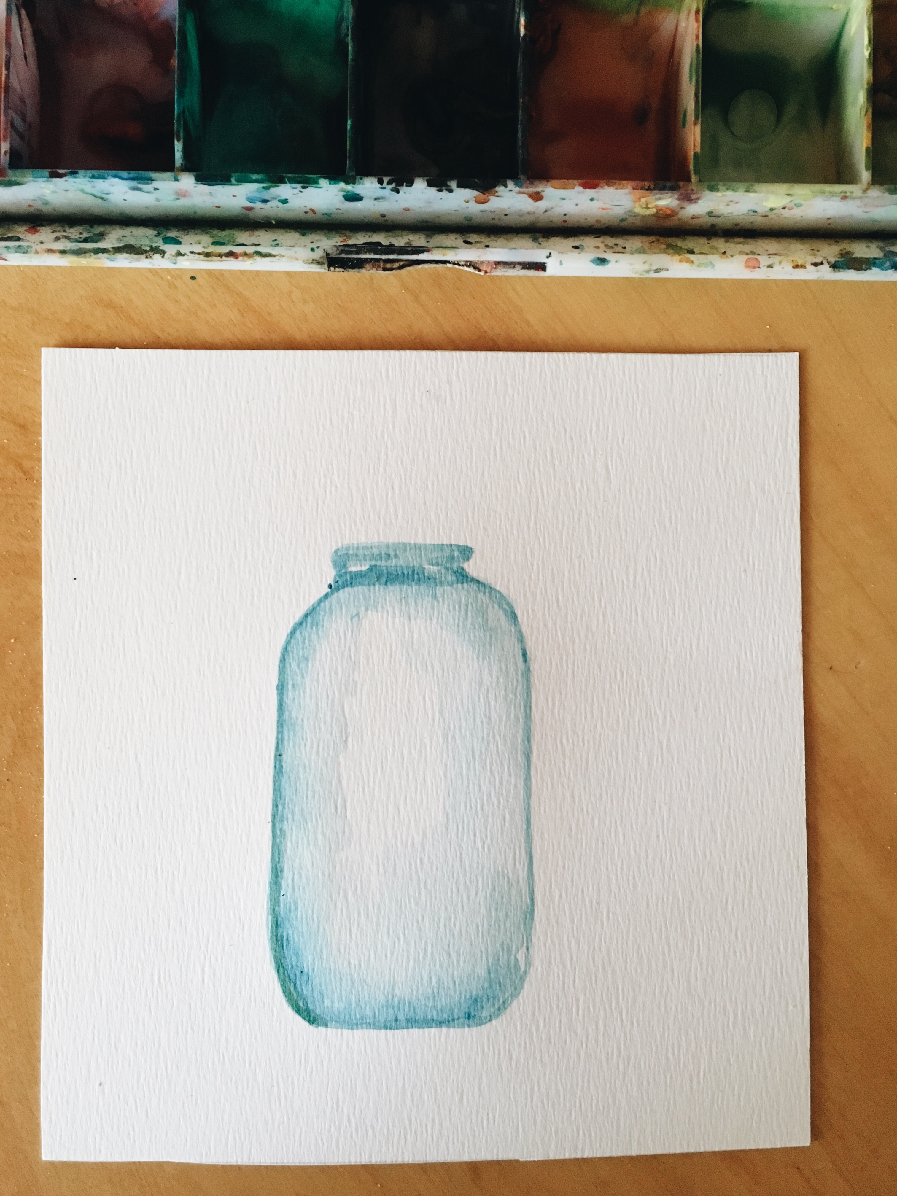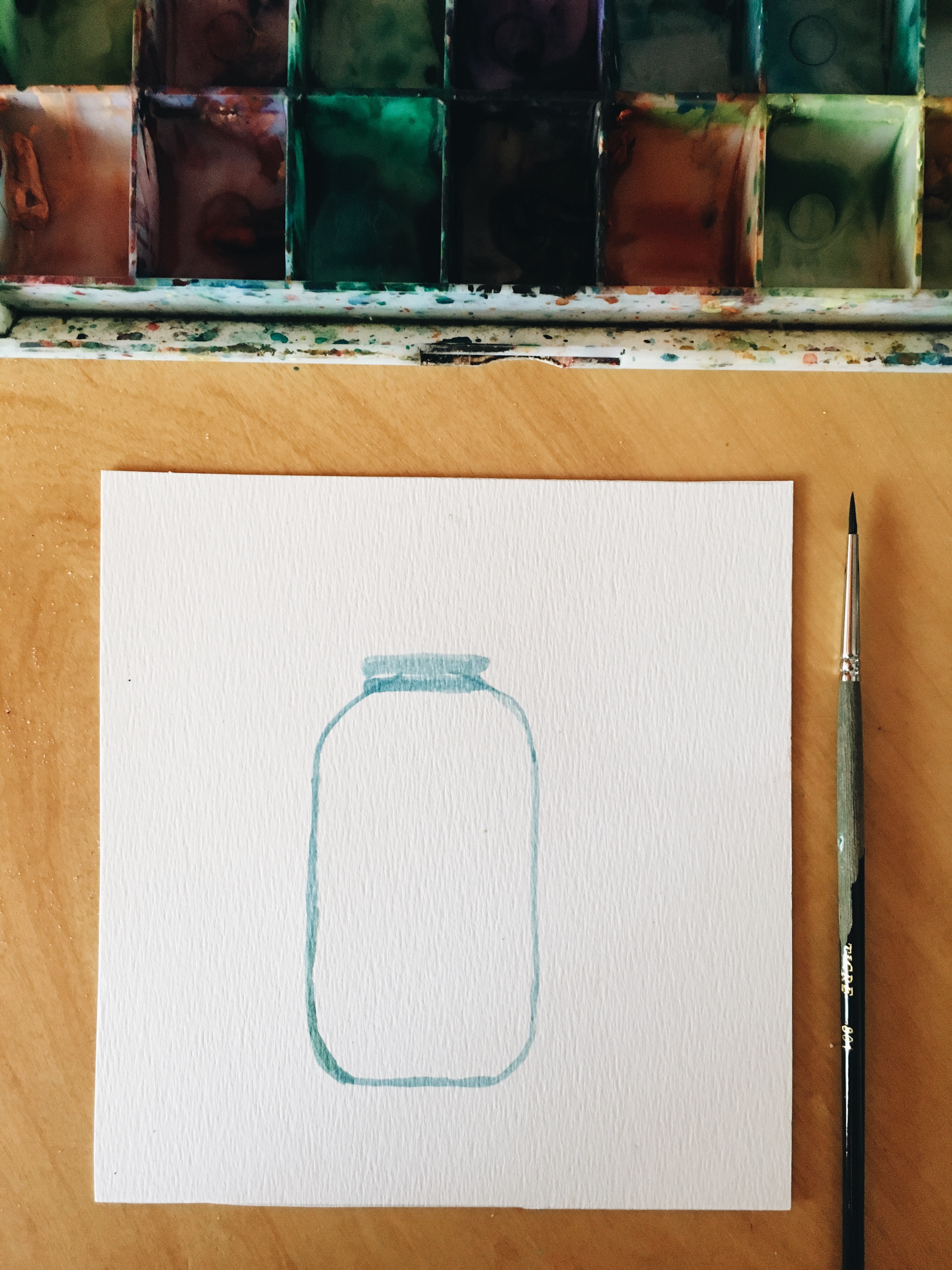 Para empezar a darle forma a nuestro frasco, dibujamos las líneas del contorno para tener la forma incial. Pueden hacer suave en lápiz y después repasar con acuarelas para sentirse más cómodas.