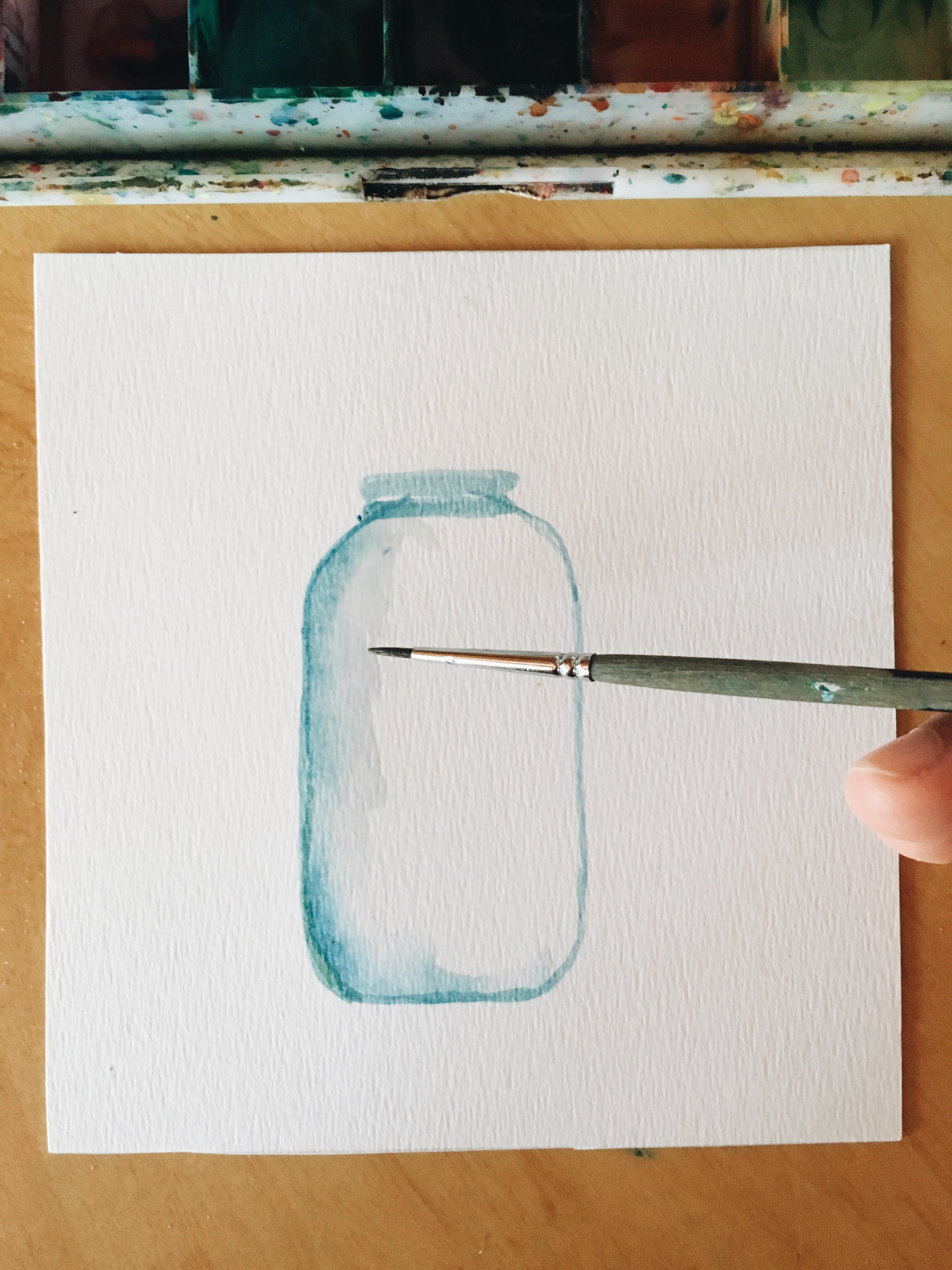 Una vez que tenemos los bordes delineados, podemos hacerle un contorno de sombra con un poco de agua, empezando desde las líneas del frasco hacia adentro. De a poco le vamos dando un poco de profundidad.